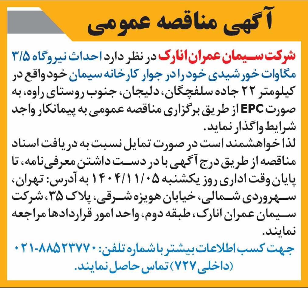 زمانبندی پرداخت سود سهام سال ۱۴۰۳ ۱۹ مرداد ۱۴۰۴ آگهی دعوت به مجمع عمومی عادی سالیانه صاحبان سهام ۱۱ تیر ۱۴۰۴ آگهی مزایده فروش اقلام ضایعاتی مازاد ۲۲ دی ۱۴۰۳ آگهی مناقصه عمومی ارائه خدمات بیمه (آتش سوزی، مسئولیت، درمان) ۲۰ آذر ۱۴۰۳ آگهی مناقصه انتخاب پیمانکار تامین نیروی انسانی و تهیه غذا ۱۲ آذر ۱۴۰۳ اطلاعیه صدور برگ سهام جدید ۲۶ آبان ۱۴۰۳ آگهی مناقصه عمومی خرید ۱۶ مگاوات برق دو جانبه ۹ آبان ۱۴۰۳ آگهی مزایده فروش اقلام ضایعاتی مازاد (ویرایش ۳) ۲۰ تیر ۱۴۰۳ آگهي دعوت به جلسه مجمع عمومي فوق العاده ۲ تیر ۱۴۰۳ آگهي دعوت به مجمع عمومي عادی ساليانه صاحبان سهام ۲ تیر ۱۴۰۳ تمدید مهلت مناقصه بیمه آتش سوزی و درمان ۱۱ دی ۱۴۰۲ آگهی مناقصه بیمه آتش سوزی و درمان ۳ دی ۱۴۰۲